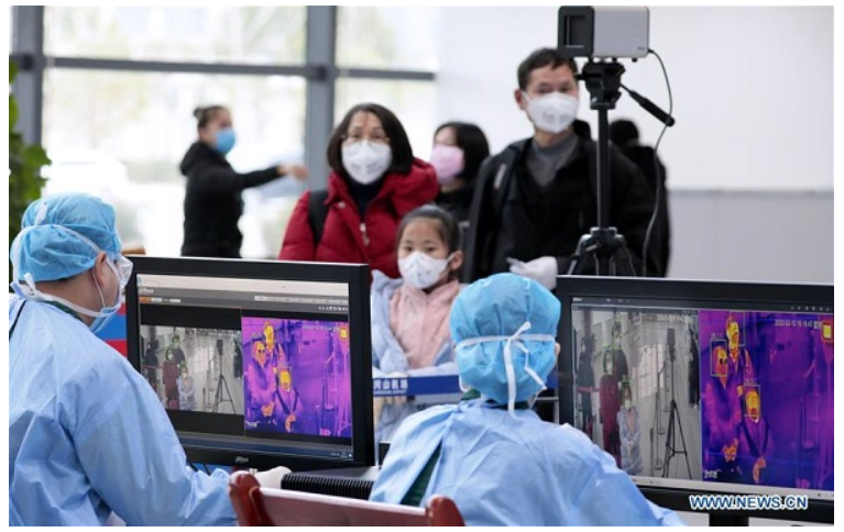 Security staff members check passengers’ temperature at Jinggangshan Airport in Ji’an, East China’s Jiangxi province, Feb 10, 2020. The airport has taken measures such as increasing disinfection frequency and testing passengers’ temperature to curb the spread of the novel coronavirus. [Photo/Xinhua]