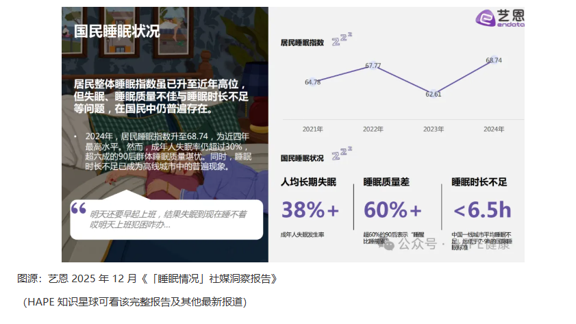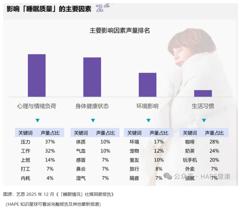 據藝恩 2025 年 12 月《「睡眠情況」社媒洞察報告》,中國超三成成年人受失眠困擾、超六成 90 后睡眠質量堪憂,推動智能床墊、睡眠監測等設備需求爆發,當前消費者對助眠產品的科學原理關注度持續提升,睡眠經濟正從“被動改善”轉向“主動管理”的科學化賽道。本文將從睡眠需求痛點切入,拆解主流干預產品的市場邏輯與產業鏈布局,為相關行業投資者、從業者、企業經營者及創業者提供系統性的參考。