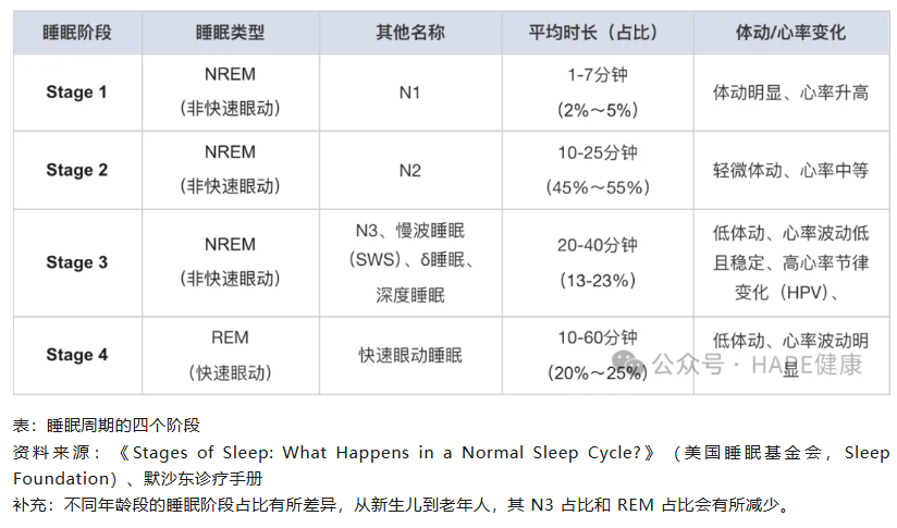 睡眠是人體身心恢復的自然過程,介于清醒與昏迷之間,意識活躍度降低、對外界刺激敏感度下降,同時伴隨腦電波、眼球運動、肌肉張力、激素分泌等一系列規律性生理變化[1]。“睡眠-覺醒”周期調節的通路主要包括“覺醒系統”、“NREM和REM系統” [2],后者交替循環形成四個睡眠階段(如下表),共同承擔代謝廢物清除、記憶鞏固等核心生理功能 [3]。