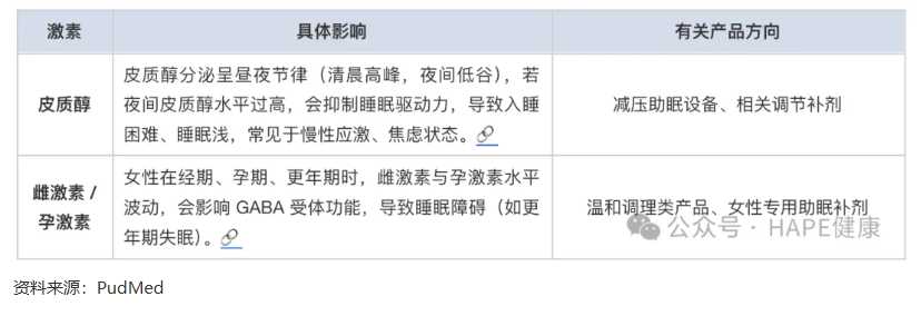 內分泌系統與睡眠調控密切相關,激素水平的波動會直接影響睡眠質量(如下表),為產品賽道提供切入點:
