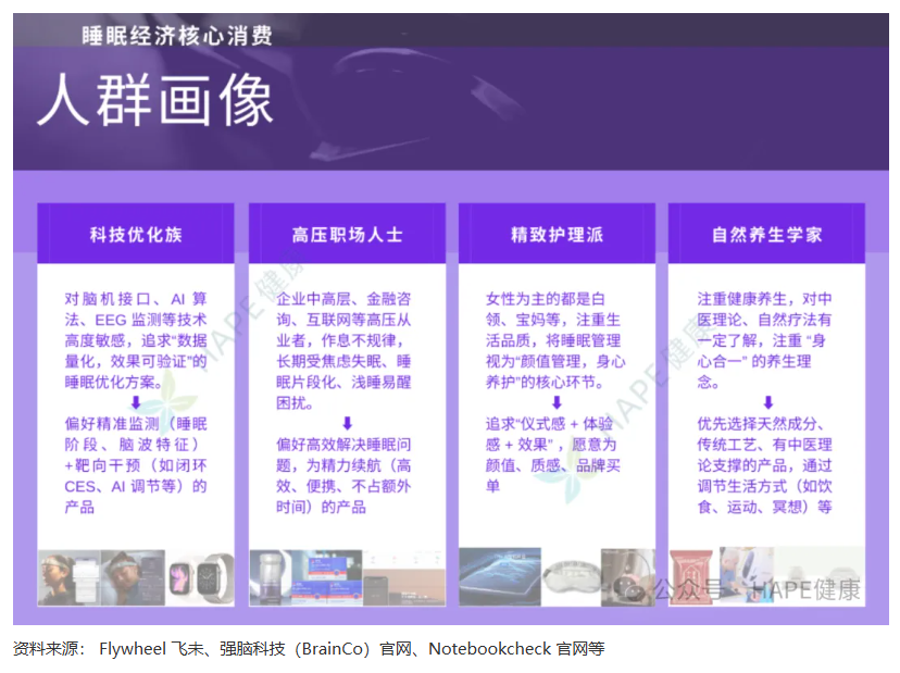 當前中國睡眠經濟的核心消費群體已形成清晰的四大圈層,分別為科技優化族、高壓職場人士、精致護理派、自然養生學家,這一群體劃分也得到了 Flywheel 飛未相關統計數據的佐證。四大群體的需求痛點與消費偏好差異顯著,為企業精準布局賽道、打造差異化產品提供了明確方向: