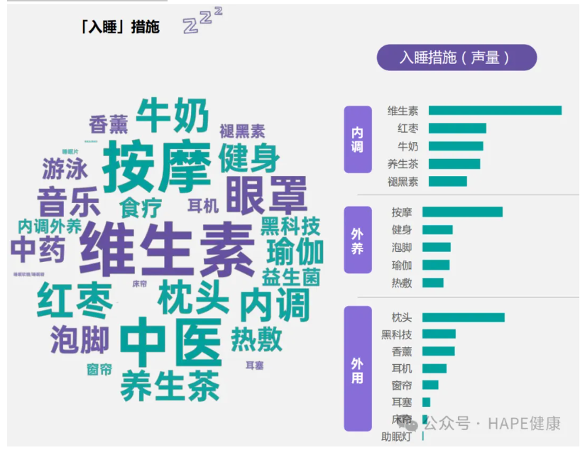 在入睡環節,人們更依賴環境與保健助眠產品,據藝恩報告聲量統計,補充維生素大眾助眠方式中的首選,褪黑素類產品市場已較為成熟,而中式傳統滋補成分產品的市場認知度正穩步提升;同時,按摩、健身、泡腳等調理方法,也成為放松身心、促進睡眠的主流選擇。企業可通過“場景內容種草 + 產品精準推薦”的模式搶占市場,如針對“睡前玩手機”人群推廣藍光過濾設備,針對“睡前焦慮”人群推廣香薰 + 冥想課程組合等。