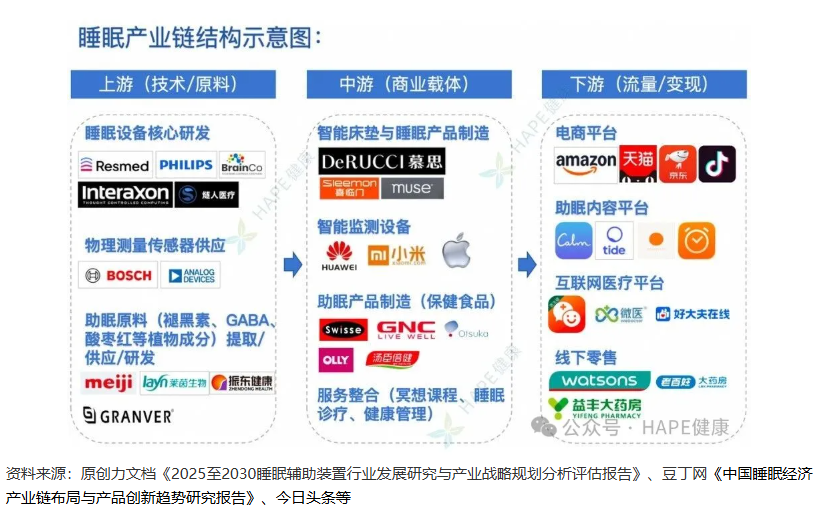 前文已分析睡眠各細分賽道,本節將進一步歸整睡眠干預的完整產業鏈結構(上–中–下游),助力行業人員全面把握產業生態、關鍵參與者及合作機會?[7]。